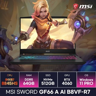 MSI Sword GF66 A AI B8VF-R7은 라이젠7-8845HS와 RTX4060의 조합으로 뛰어난 성능을 자랑합니다. 64GB RAM과 Win11을 탑재하여 고사양 게임도 부드럽게 실행할 수 있습니다. 현재 15% 할인된 1,550,000원에 구매 가능하며, 사용자들은 가성비에 높은 만족도를 표하고 있습니다.